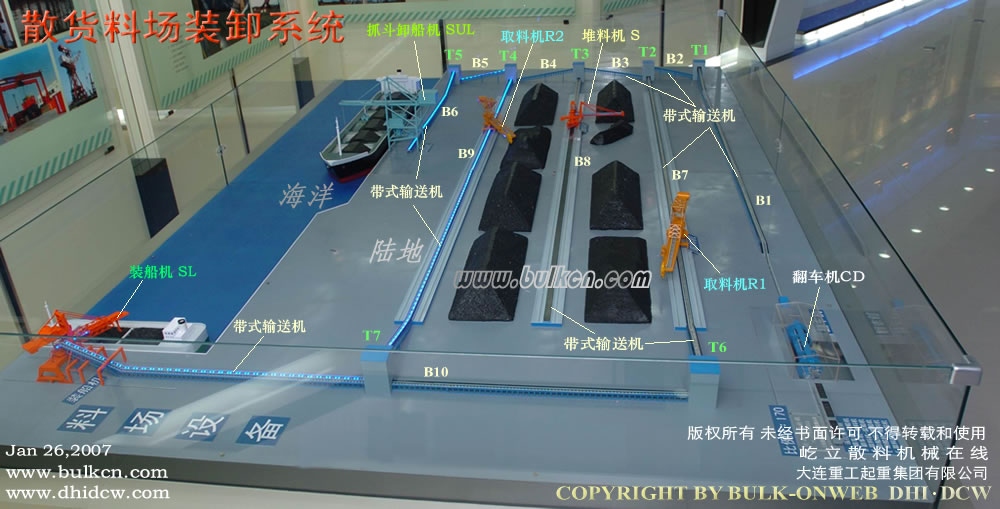 本系统是一个卸车、卸船、装船码头的装卸系统。 在本系统中设有两个靠船泊位。一个卸船泊位,一个装船泊位。两个条形料场。料场系统的功能是卸火车的来料,卸大船的来料,为小型船装船。为了提高效率,在系统中设有可以直接在卸车的同时装船或在卸船的同时直接装船的工艺流程。本系统共有6个流程,其中常用的为4个流程。本流程为一个示例,在许多的用户的实际使用中可以根据自己的需要举一反三的进行变化。但是,在确定并施工以后是不易进行过多的更改的。 在系统中主要设备组成: