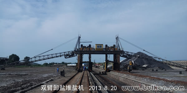 由门架皮带机运到悬臂皮带机,再由悬臂皮带机将盐运到需要堆放的料场位置。
