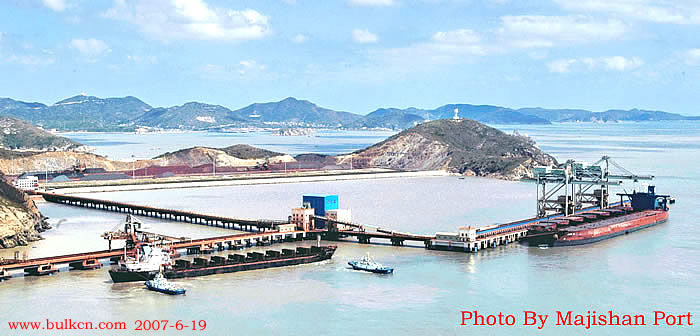 马迹山铁矿石中转基地是上海宝钢三期工程的重要配套项目,主要承担宝钢进口铁矿石中转业务,已经成为亚洲第一矿石中转深水港区,一期工程占地面积48万平方米,拥有25万吨级兼靠30万吨级卸船码头和3.5万吨级装船码头各一座,年设计吞吐能力为2000万吨。马迹山港区有大于25米的深水岸线长2500米,深水水域面积达20平方公里,进港航道顺直,水深在22米以上。