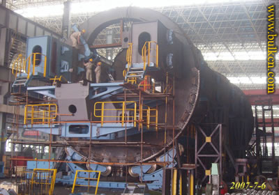 本站讯:2007年7月8日,我国自行设计制造的具有自主知识产权的三车翻车机在大连重工起重集团有限公司下线。近日该翻车机将安装到秦皇岛港煤三期工程。该翻车机的特点在于:翻车机的转子钢结构由两个全箱形端环及由全箱形的前侧梁、后侧梁、平台梁及工字联系环连接而成;各梁与端环的连接处均采用变截面梁;在平台梁的两侧面上对称设计了平台侧梁,在平台侧梁上对称装压车机构;其靠车板一侧加工成凹槽形;采用了新型翻车机缓冲装置(已申报专利);采用了新型靠车同步系统。整个翻车机具有结构合理,性能可靠,寿命更高而且维修、使用安全方便等优点。该项目是中国第一个机、电、液均自主设计的三车翻车机项目;该翻车机是国际上第一个三箱形梁两箱形端环的三车翻车机;是中国第一台具有完全自主知识产权的三车翻车机。该机型已获国家知识产权局授权