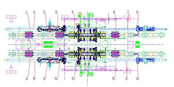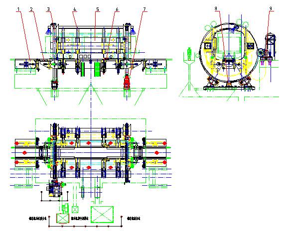 翻车机的主要设备组成为:1,伸缩平台地面段 2,伸缩平台机上段 3,翻车机转子钢结构 4,翻车机压车装置 5,翻车机靠板装置 6,翻车机逆止器 7,拖辊装置 8,缓冲及锁定装置 9,马达单侧驱动装置。