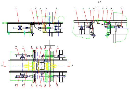 翻车机平台两端的延伸平台装置主要由轨道变换机构:(1)旋转轨道、(2)旋转支架、(4)绞轴、(5)驱动油缸等;及锁紧机构:(11)锁紧锥销、(10)锁紧支架、(7)锁紧驱动油缸等组成。地面上装有同样的装置分别用相同号码加“`”表示。