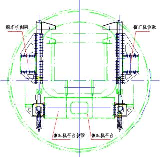 考虑用户使用维护的方便性,笔者采用了液压压车弹簧卸荷的压车机构,本压车机构的一个显著的特点为:为了方便用户的使用维护及降低钢结构的应力,构思了在翻车机平台上长出侧梁,将压车油缸布置到平台侧梁上的结构(见图4)。