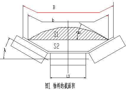皮带的宽度与皮带的速度共同决定皮带机的输送能力。悬臂皮带机的输送能力应满足堆料与取料两种工况的要求。皮带的宽度可根据皮带上物料的截面积公式计算得出。见图1。