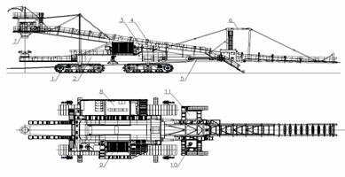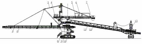 1.排料臂 2.排料皮带机 3.俯仰机构 4.履带走行装置 5.回转装置及门座架 6.回转钢结构