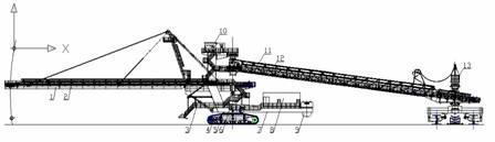 8. 履带走行装置 9. 回转装置及门座架 10. 回转钢结构 11.受料臂 12.受料皮带机 13.卸料车