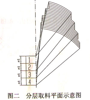 | 图1为取料时在纵向平面的示意图,图二为取料工艺在水平面的示意图,图中1为最上层,2为料堆的最底层。在同一层上悬臂每回转一个单程大车进尺一次,直到进尺n次为止,再进行换层。设备的回转角度也会随着所取料堆的层数位置的变化而变化。最底时回转角度范围最大,最上层时回转的角度范围最小,不同参数设备的每层进尺次数和进尺量是不同的。取料时其简单的过程为,第一层:大车进尺->回转取料->大车进尺->回转取料......大车进尺->回转取料->大车调车、调整俯仰到第二层->大车进尺->回转取料->大车进尺->回转取料......大车进尺->回转取料->大车调车、调整俯仰到第三层->大车进尺->回转取料->大车进尺->回转取料......大车进尺->回转取料->大车调车、调整俯仰到最底层->大车进尺->回转取料->大车进尺->回转取料......大车进尺->回转取料->大车调车、调整俯仰到第一层,.......