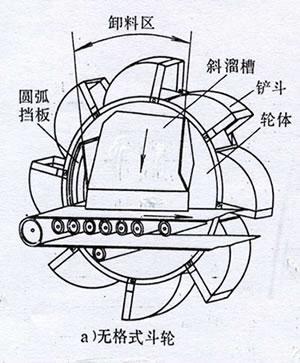 无格式斗轮主要应用在取磨损性较小的物料的斗轮装置上上,如应用在取煤炭等物料时,常常采用无格式斗轮。相对与有格式斗轮,无格式斗轮相对斗轮直径一般会略小一点,斗轮转速也回略高一点。无格式斗轮相对于有格式斗轮卸料要容易一些。当圆弧挡料板磨损严重时往往需要拆卸斗轮维修,相对维修较困难。
