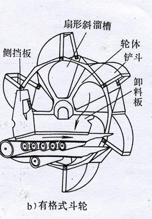 有格式斗轮主要应用在取磨损性较大的物料的斗轮堆取料机设备上,如取铁矿石、石灰石等物料时,常常采用有格式斗轮。有格式斗轮的设计与制造相对要复杂一些,自重相对要重一些。有格式斗轮不需要更换或维护圆弧挡料板。斗轮斜溜槽处设有耐磨衬板,磨损后更换,相对维修比较方便容易。